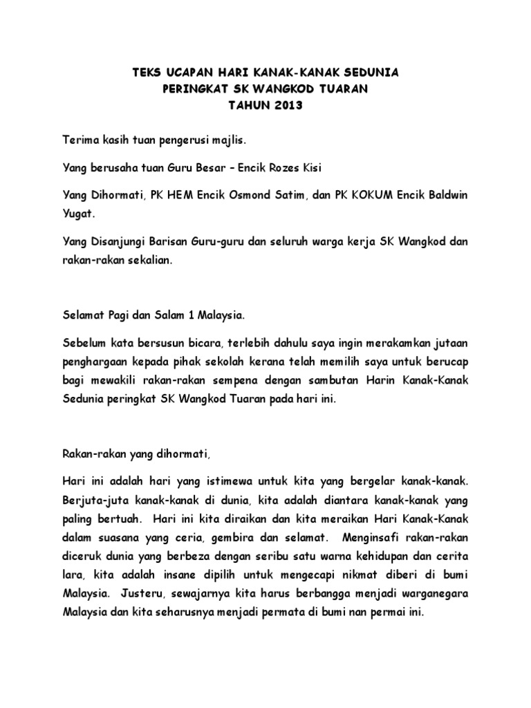 ICD berasal daripada Persidangan Dunia untuk Kesejahteraan Kanak-kanak di Geneva Switzerland pada tahun 1925Tidaklah jelas mengapa 1 Jun ditetapkan sebagai Hari. Contoh Karangan - Hari Kanak-kanak Hari Kanak-kanak Pada 15hb Oktober 2010 sekolah saya menyambut Hari Kanak-kanak. Semua murid berasa sangat gembira kerana mendapat banyak hadiah pada hari tersebut.